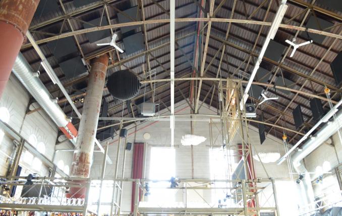 Because the ceiling is at a height of almost fifteen meters, the assembly was not an easy task. "Because of the steel construction, trusses and all the ductwork, not all fixing locations were easily accessible. We had to use scaffolding and a theatre aerial platform to be able to place all the materials in the right place. It was quite a puzzle to determine the most efficient routing, but in the end we succeeded. Transportation to the construction site was also a challenge, says Merford. Because the acoustic elements are not only large and heavy, but also quite soft, dents were lurking. We prevented this by carefully placing the clouds on trestles in the truck and by assembling the large, black sphere on site instead of at our workplace".