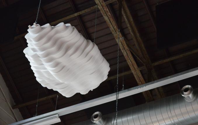 De Vos and Stapel also designed two acoustic clouds and the letters LUMIERE. Merford made those of custom and assembled polyester wool sheets. The letters were hung at a height of about 10 metres. The clouds are approximately 1.10 metres wide, 1.50 metres long and 0.5 metres high and are eye-catchers in the room, next to a globe of black polyester wool sheets with a diameter of 1.20 metres. The clouds and the sphere are mounted to the steel construction without drilling.