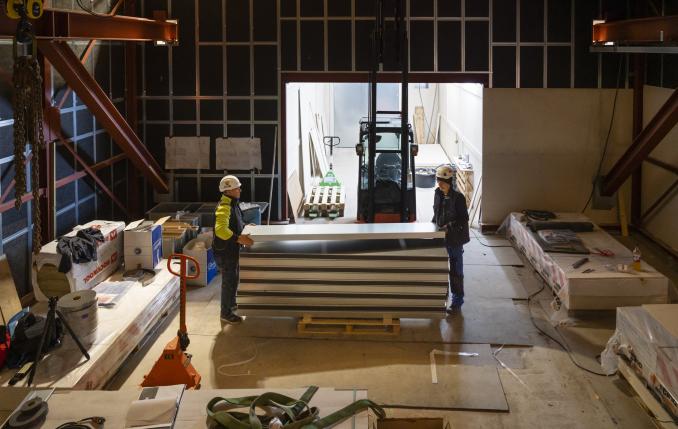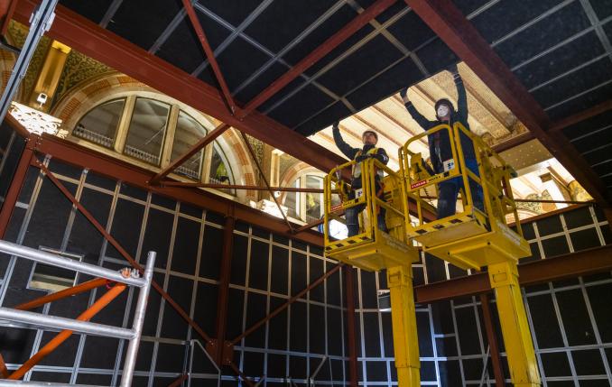 De brandwerendheid was één van de uitdagingen, verzekert Ronald: ‘Er waren een paar complexe factoren.’ De belastbaarheid van de vloer bijvoorbeeld. Die is beperkt in het monumentale station. De stalen constructie waaraan de geluidswerende panelen zijn bevestigd, rust daarom op steunpunten aan de zijkanten van de hal. ‘Specialistisch werk’, weet Ronald. ‘Voor die berekeningen, de bouw van het frame en de bovenloopkraan werkten we daarom samen met onderaannemers.’ In de voorbereiding dacht Merford ook mee over de vorm van de omkasting. ‘In geval van nood, moet iedereen snel de stationshal kunnen verlaten zonder daarbij tegen scherpe punten aan te lopen’, schetst Ronald. ‘Daarom heeft de omkasting afgeschuinde hoeken.’ In de uitvoering waren de grootste uitdagingen ruimte en tijd. ‘In een krappe ruimte werken zijn we wel gewend, maar dit is wel écht een postzegel. Er was bijvoorbeeld geen ruimte om materieel neer te zetten. Dat vereist een goede afstemming en veel flexibiliteit van de bouwers.’