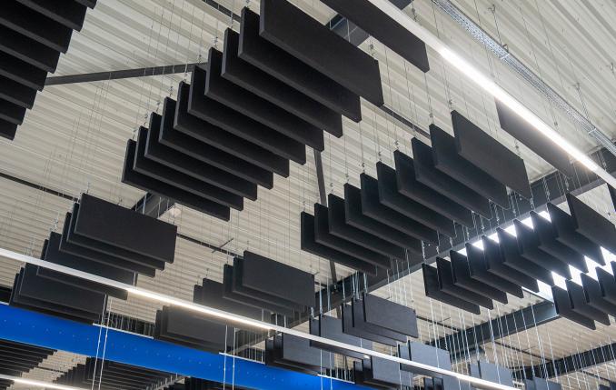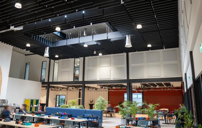 Merford heeft het vraagstuk vervolgens opgepakt en een oplossing ontwikkeld om de akoestiek in de ruimtes te optimaliseren met geluidsabsorberende Akotherm panelen. De uitdaging voor Merford was het ophangen van de vele op maat gemaakte Akotherm panelen terwijl de ruimtes nog actief in gebruik waren. Veel werkzaamheden zijn daarom (in afstemming met Fijnder) ’s avonds uitgevoerd.