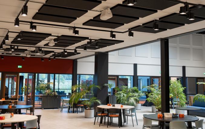 Sinds 1 maart 2022 heeft Fijnder een gloednieuwe locatie. Onder andere voorzien van een grote moderne werkplaats en een prachtig bedrijfsrestaurant, maar door de grootte en de hoogte van de ruimtes was de akoestiek allesbehalve aangenaam. Na een akoestische meting was het duidelijk dat er een probleem was met de nagalmtijd.